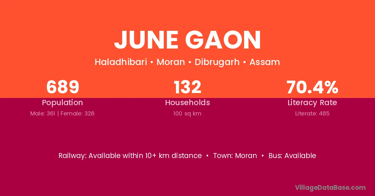 June Gaon village has a total population of 689 people, of which 361 are males and 328 are females.