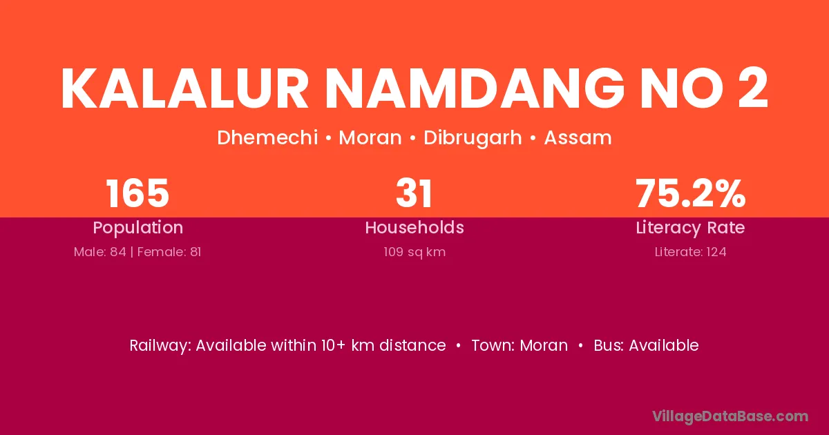 Kalalur Namdang No 2 village has a total population of 165 people, of which 84 are males and 81 are females.