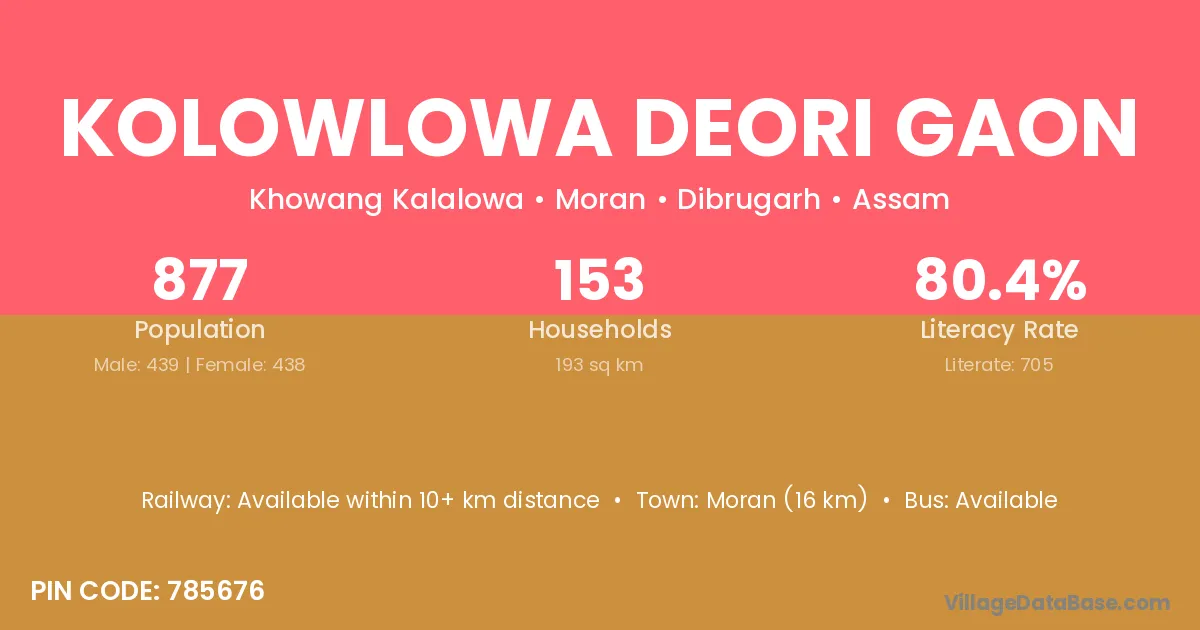 Kolowlowa Deori Gaon village has a total population of 877 people, of which 439 are males and 438 are females.