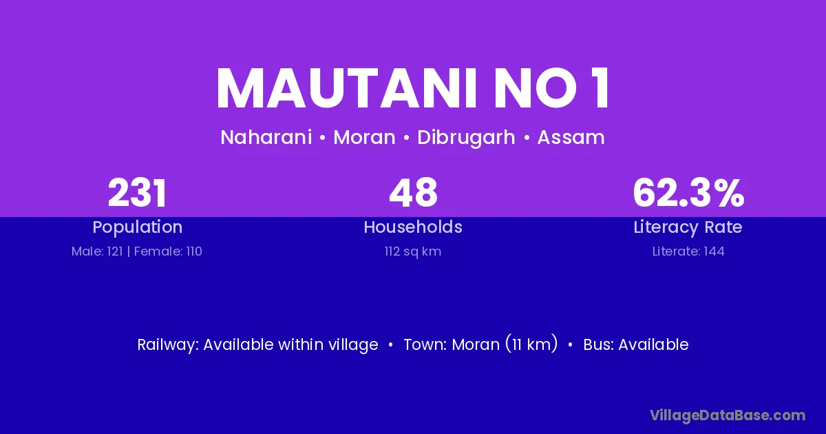 Moran (11 km) is the nearest town to Mautani No 1 village for major economic activities and is located approximately 11 km away.