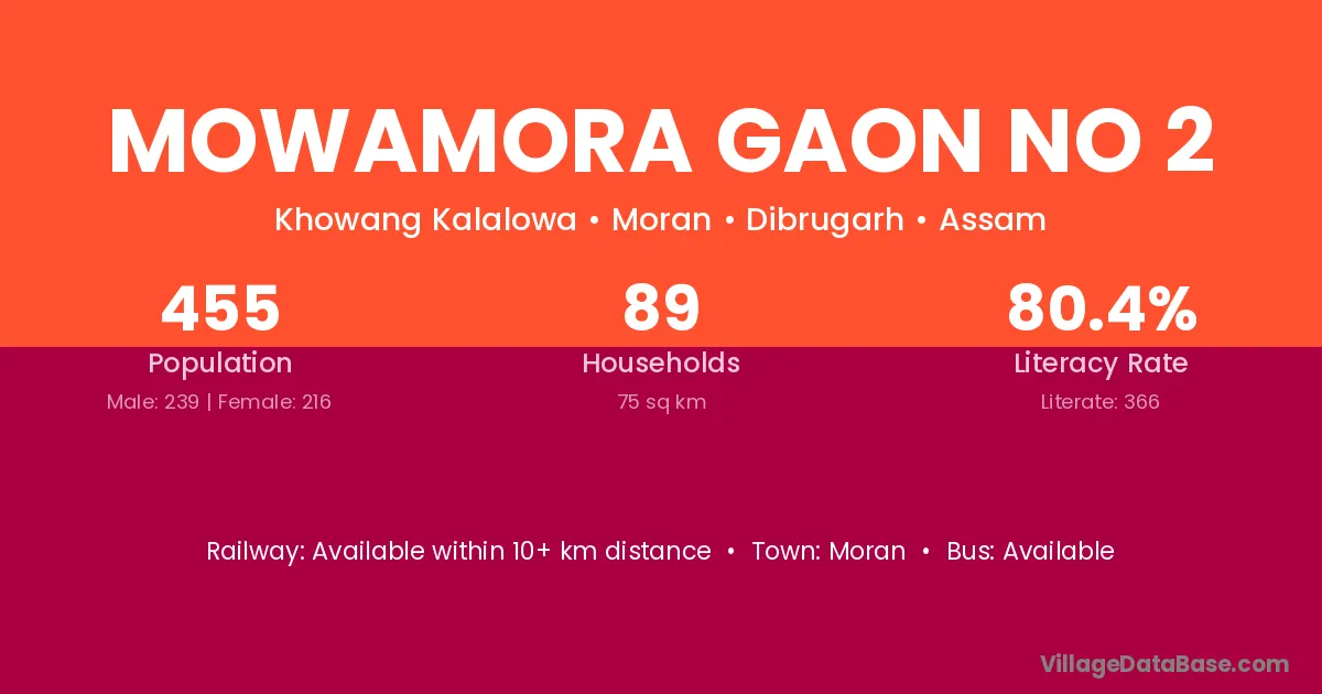 Mowamora Gaon No 2 village has a total population of 455 people, of which 239 are males and 216 are females.