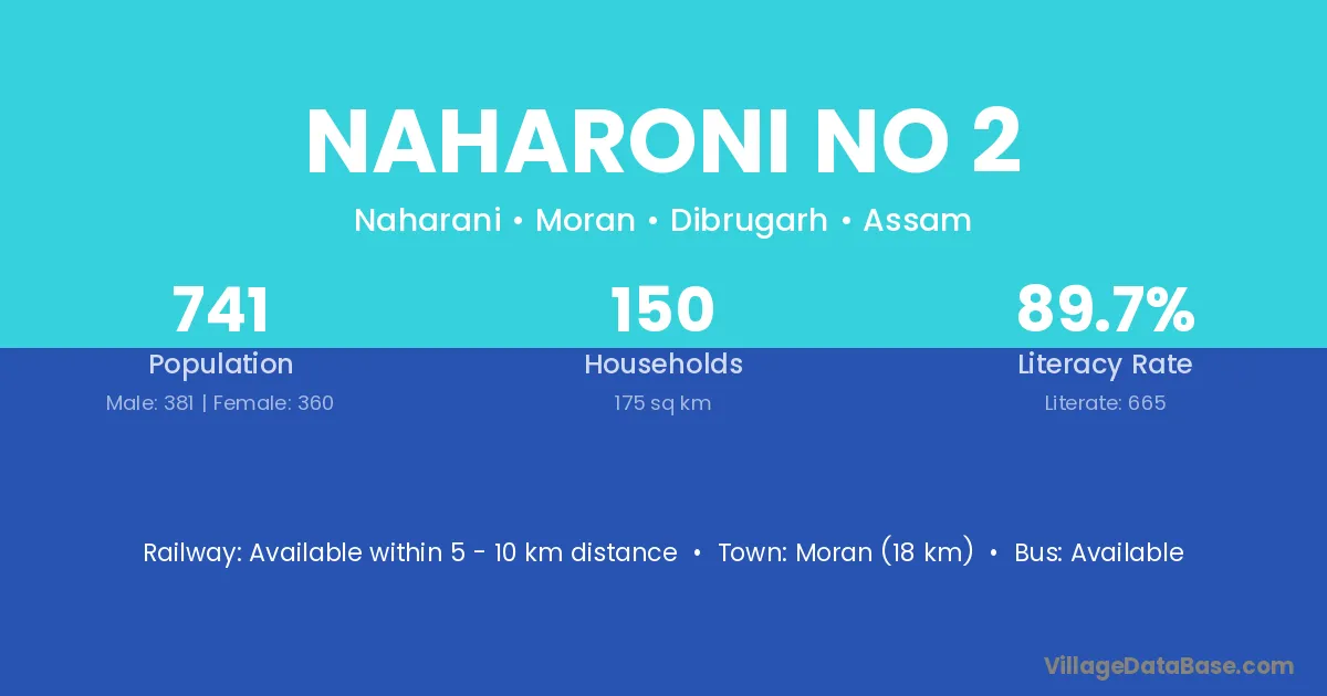 Moran (18 km) is the nearest town to Naharoni No 2 village for major economic activities and is located approximately 18 km away.