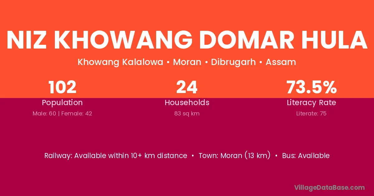 Moran (13 km) is the nearest town to Niz Khowang Domar Hula village for major economic activities and is located approximately 13 km away.
