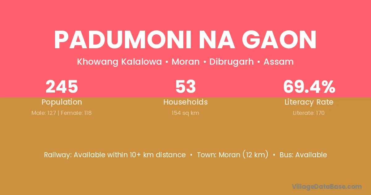 Moran (12 km) is the nearest town to Padumoni Na Gaon village for major economic activities and is located approximately 12 km away.