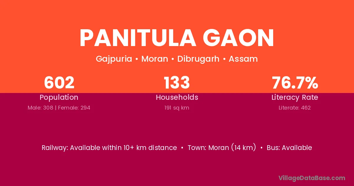 Panitula Gaon village has a total population of 602 people, of which 308 are males and 294 are females.