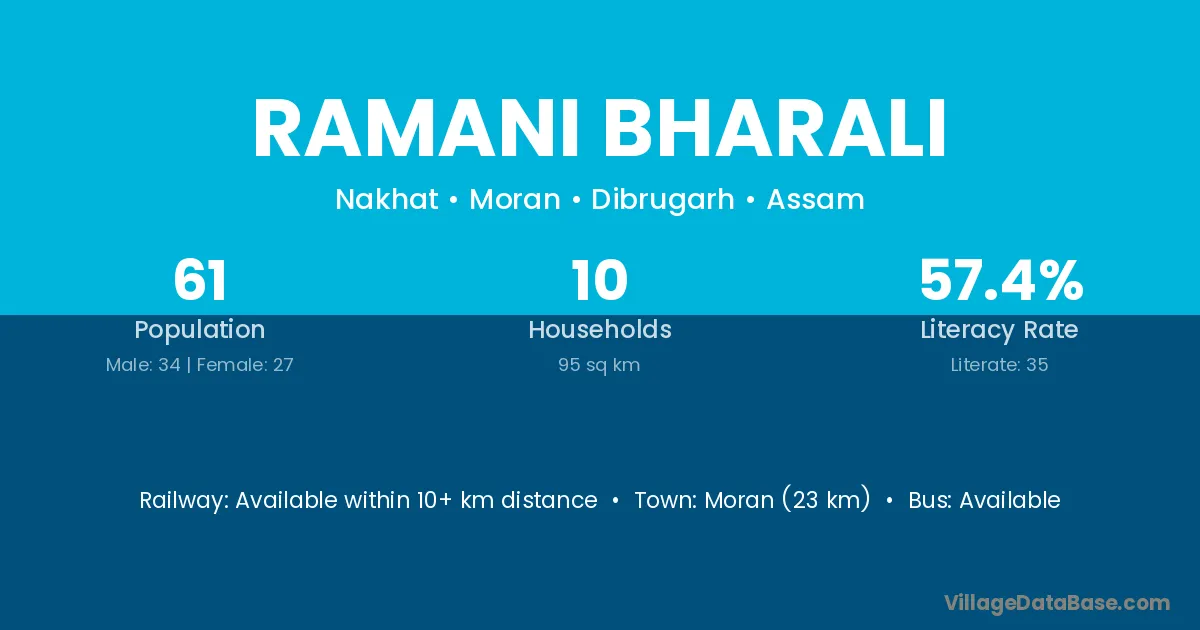 Ramani Bharali village has a total population of 61 people, of which 34 are males and 27 are females.