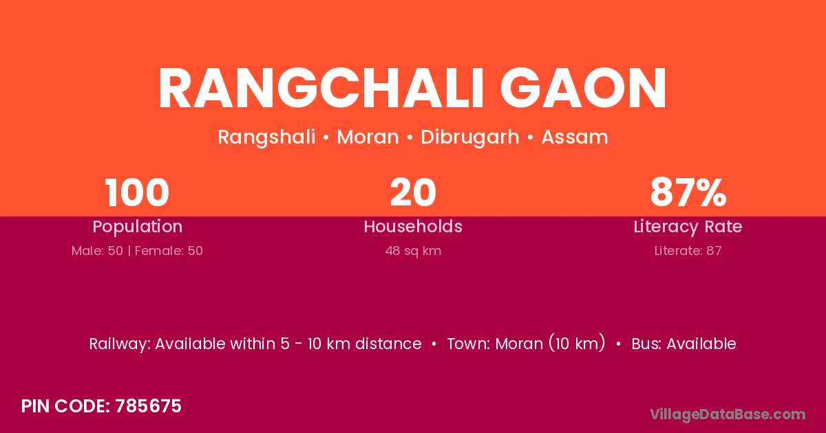 Moran (10 km) is the nearest town to Rangchali Gaon village for major economic activities and is located approximately 10 km away.