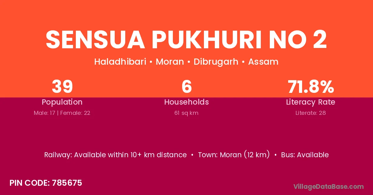 Moran (12 km) is the nearest town to Sensua Pukhuri No 2 village for major economic activities and is located approximately 12 km away.
