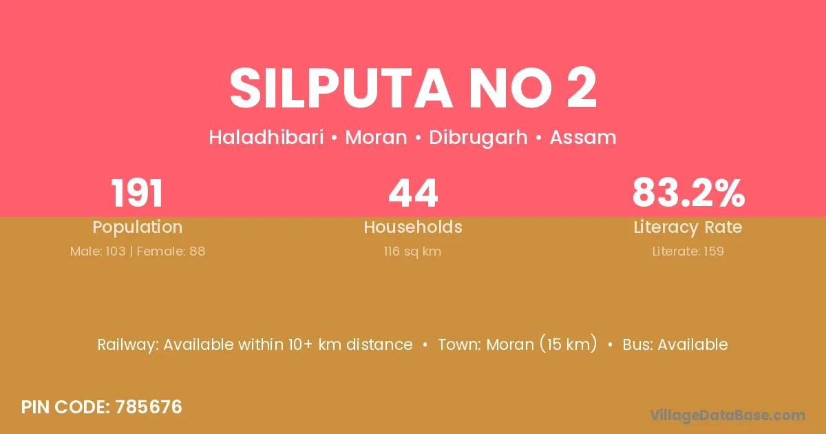 Moran (15 km) is the nearest town to Silputa No 2 village for major economic activities and is located approximately 15 km away.