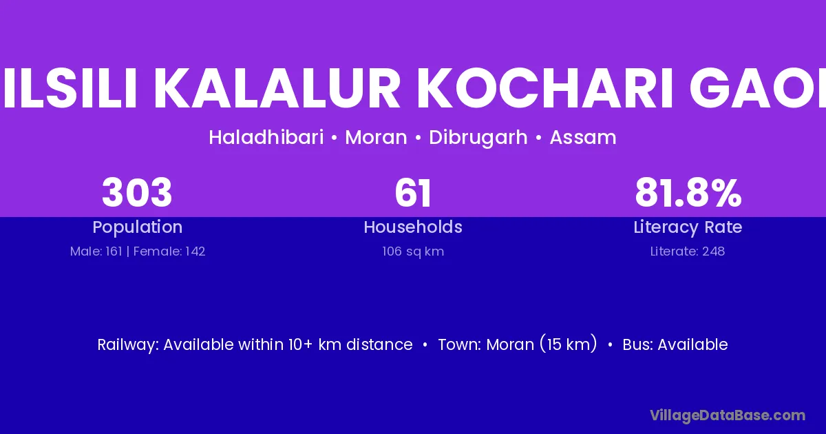Moran (15 km) is the nearest town to Silsili Kalalur Kochari Gaon village for major economic activities and is located approximately 15 km away.