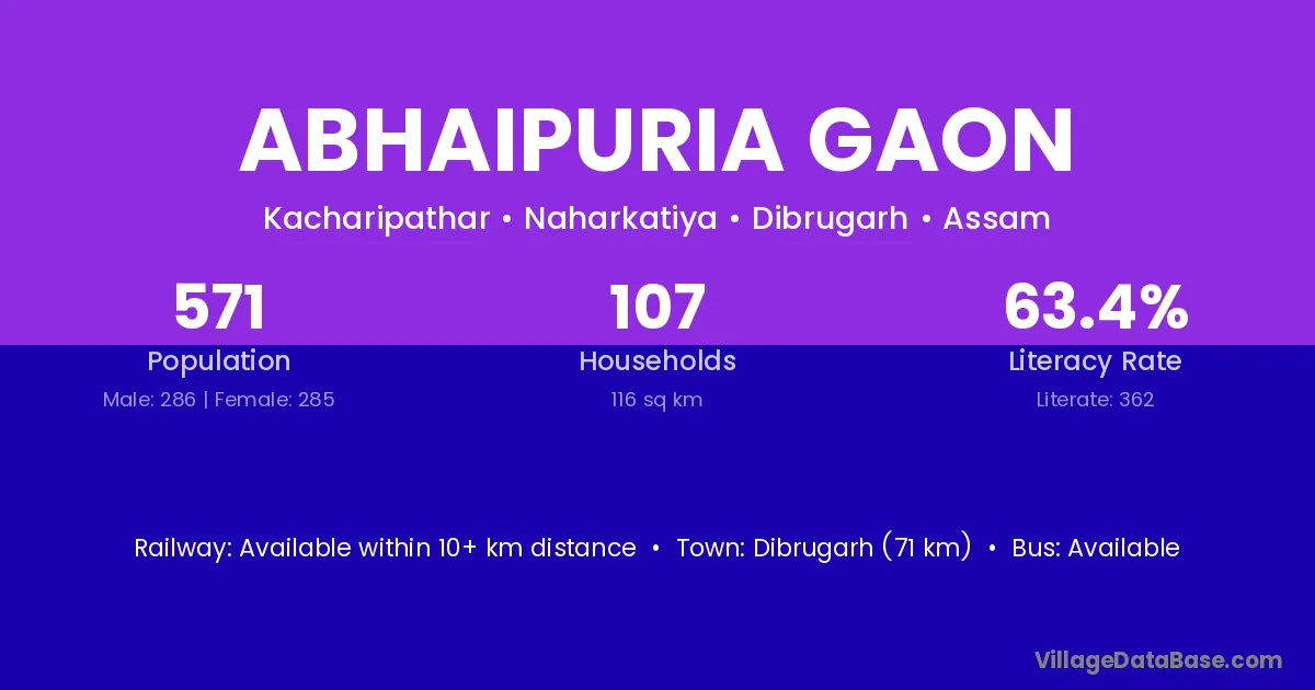 Abhaipuria Gaon village has a total population of 571 people, of which 286 are males and 285 are females.