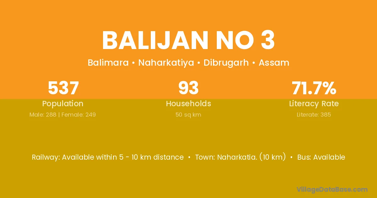 Naharkatia. (10 km) is the nearest town to Balijan No 3 village for major economic activities and is located approximately 10 km away.
