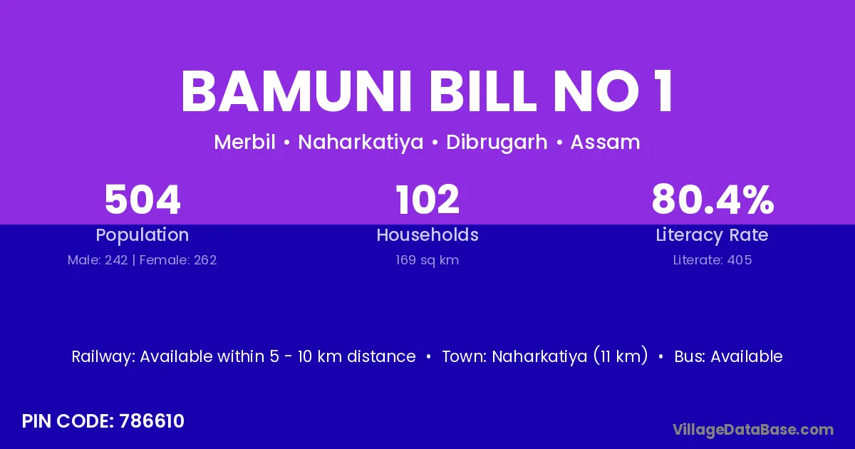 Bamuni Bill No 1 village has a total population of 504 people, of which 242 are males and 262 are females.