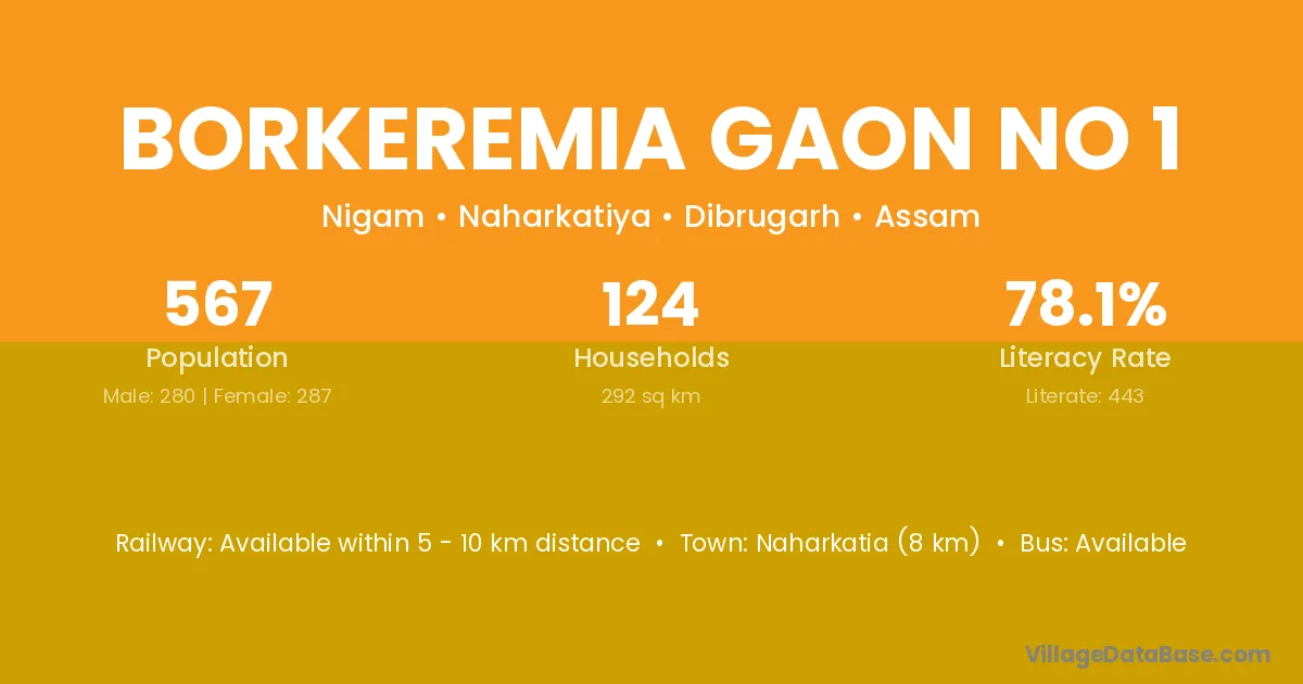 Naharkatia (8 km) is the nearest town to Borkeremia Gaon No 1 village for major economic activities and is located approximately 8 km away.