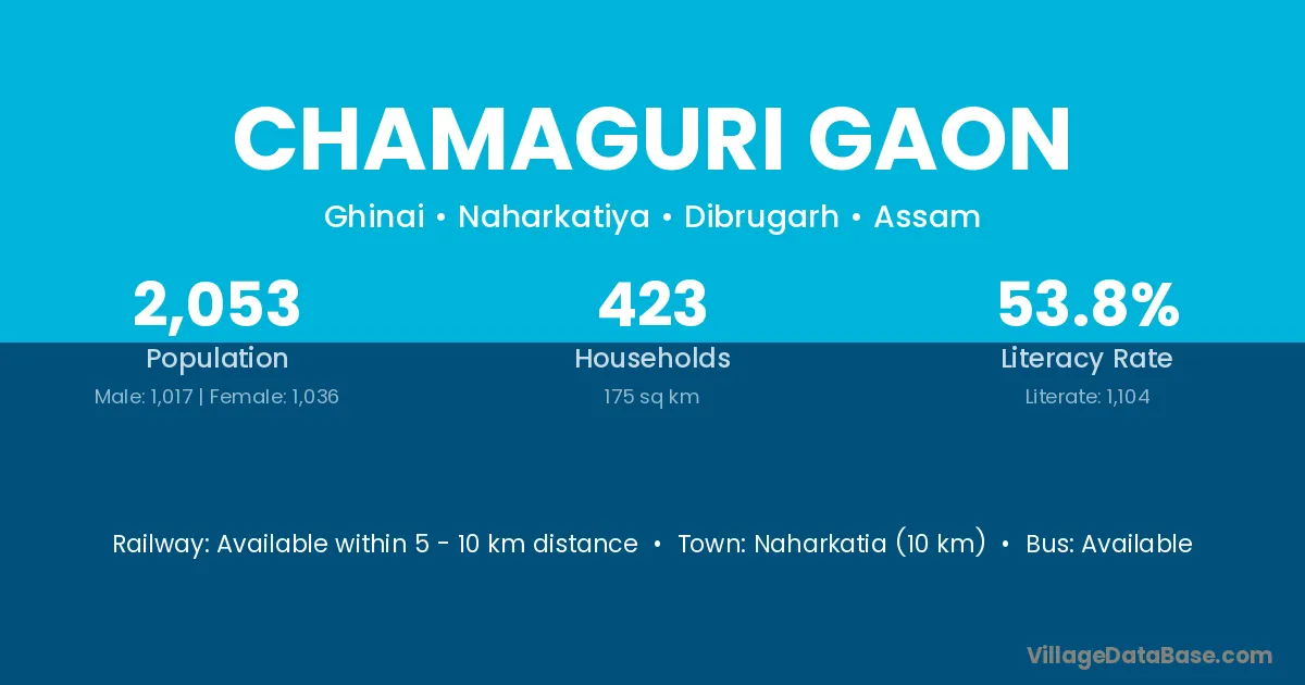 Chamaguri Gaon village has a total population of 2,053 people, of which 1,017 are males and 1,036 are females.