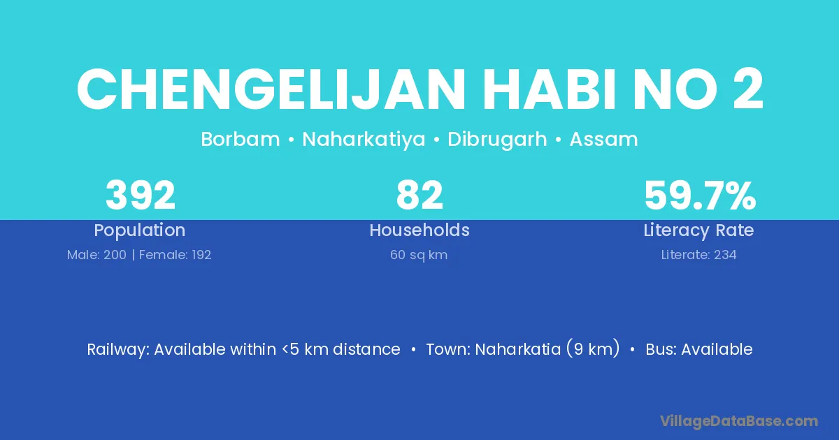 Naharkatia (9 km) is the nearest town to Chengelijan Habi No 2 village for major economic activities and is located approximately 9 km away.