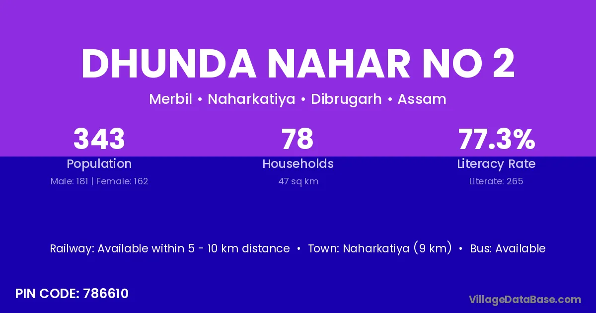 Dhunda Nahar No 2 village has a total population of 343 people, of which 181 are males and 162 are females.