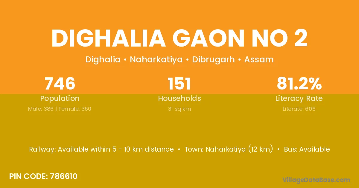 Dighalia Gaon No 2 village has a total population of 746 people, of which 386 are males and 360 are females.