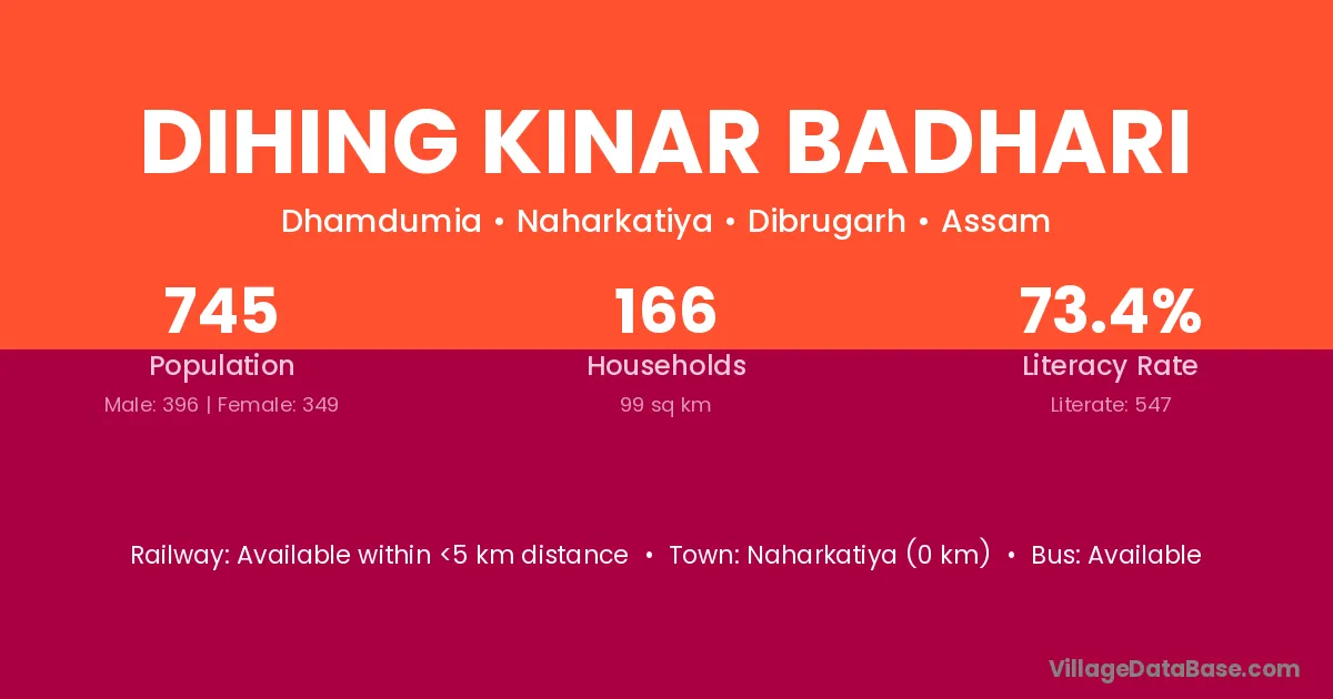 Dihing Kinar Badhari village has a total population of 745 people, of which 396 are males and 349 are females.