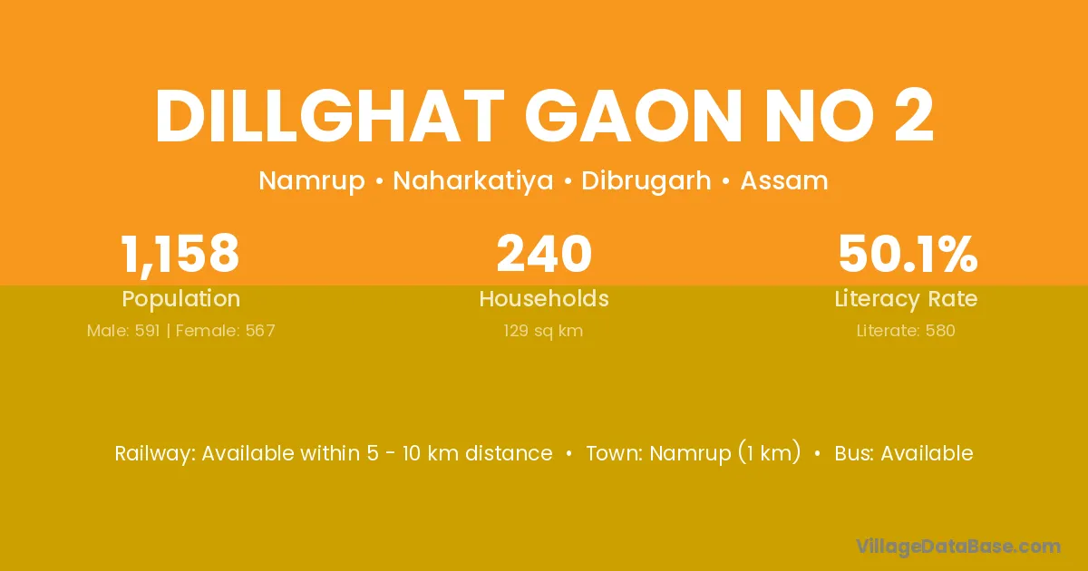 Namrup (1 km) is the nearest town to Dillghat Gaon No 2 village for major economic activities and is located approximately 1 km away.