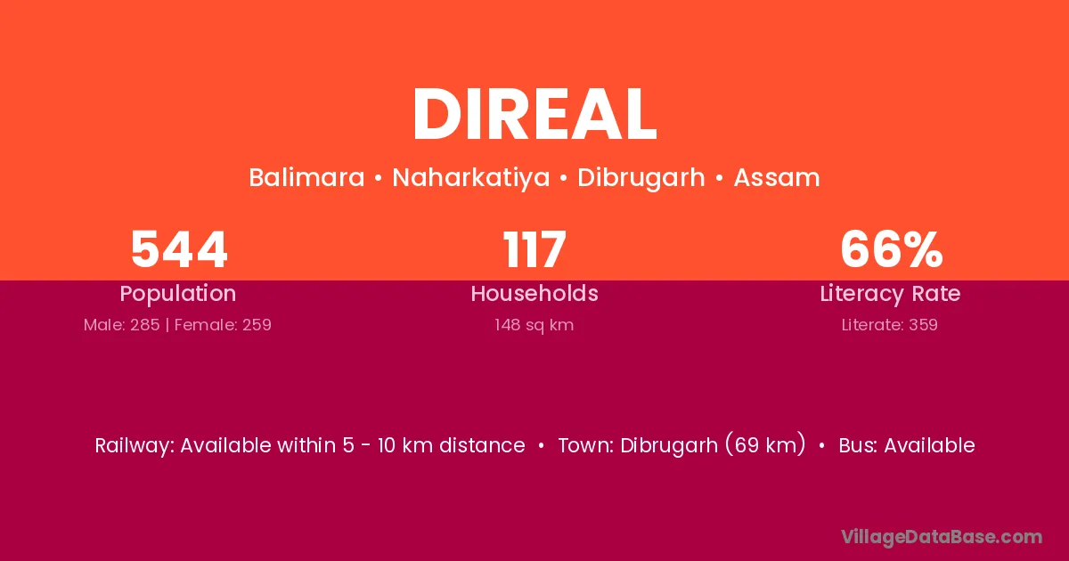 Dibrugarh (69 km) is the nearest town to Direal village for major economic activities and is located approximately 69 km away.