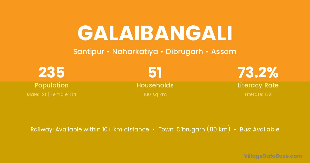 Dibrugarh (80 km) is the nearest town to Galaibangali village for major economic activities and is located approximately 80 km away.