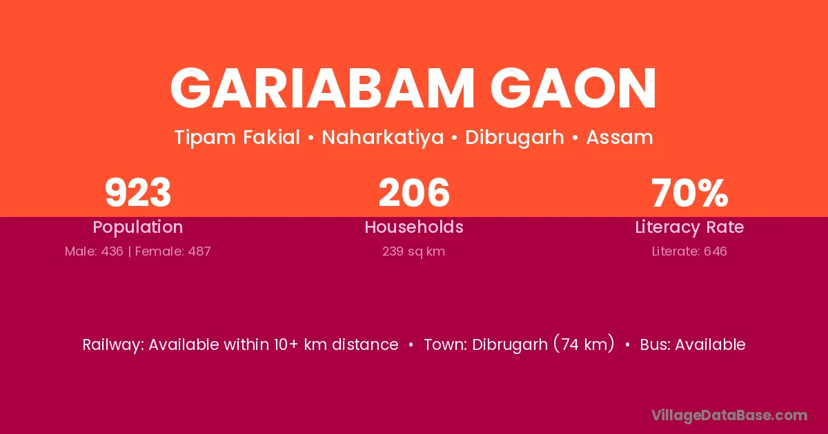 Dibrugarh (74 km) is the nearest town to Gariabam Gaon village for major economic activities and is located approximately 74 km away.