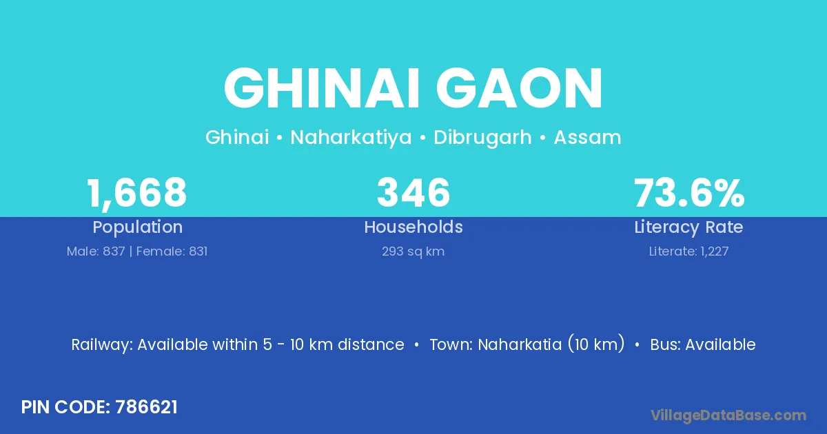 Naharkatia (10 km) is the nearest town to Ghinai Gaon village for major economic activities and is located approximately 10 km away.