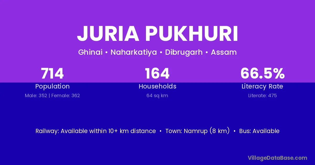 Namrup (8 km) is the nearest town to Juria Pukhuri village for major economic activities and is located approximately 8 km away.