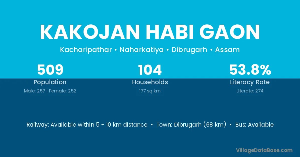 Kakojan Habi Gaon village has a total population of 509 people, of which 257 are males and 252 are females.