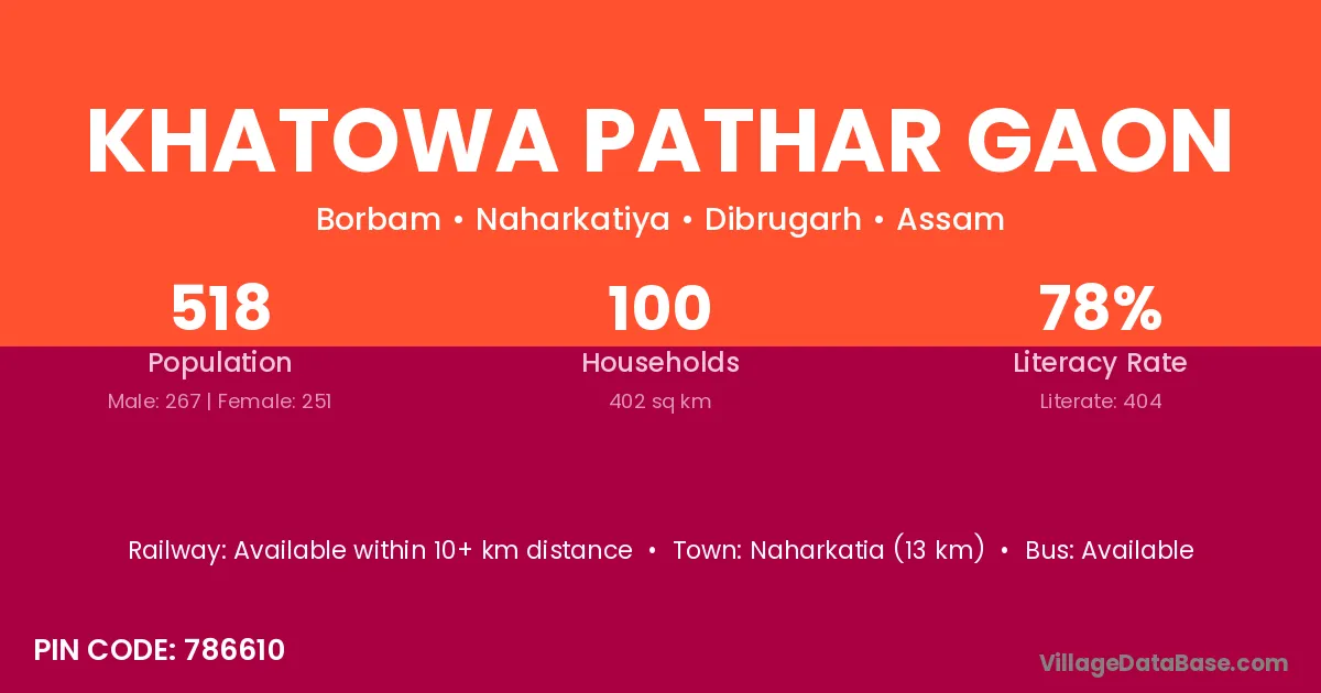 Naharkatia (13 km) is the nearest town to Khatowa Pathar Gaon village for major economic activities and is located approximately 13 km away.