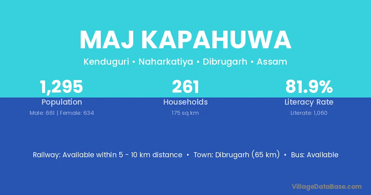 Dibrugarh (65 km) is the nearest town to Maj Kapahuwa village for major economic activities and is located approximately 65 km away.