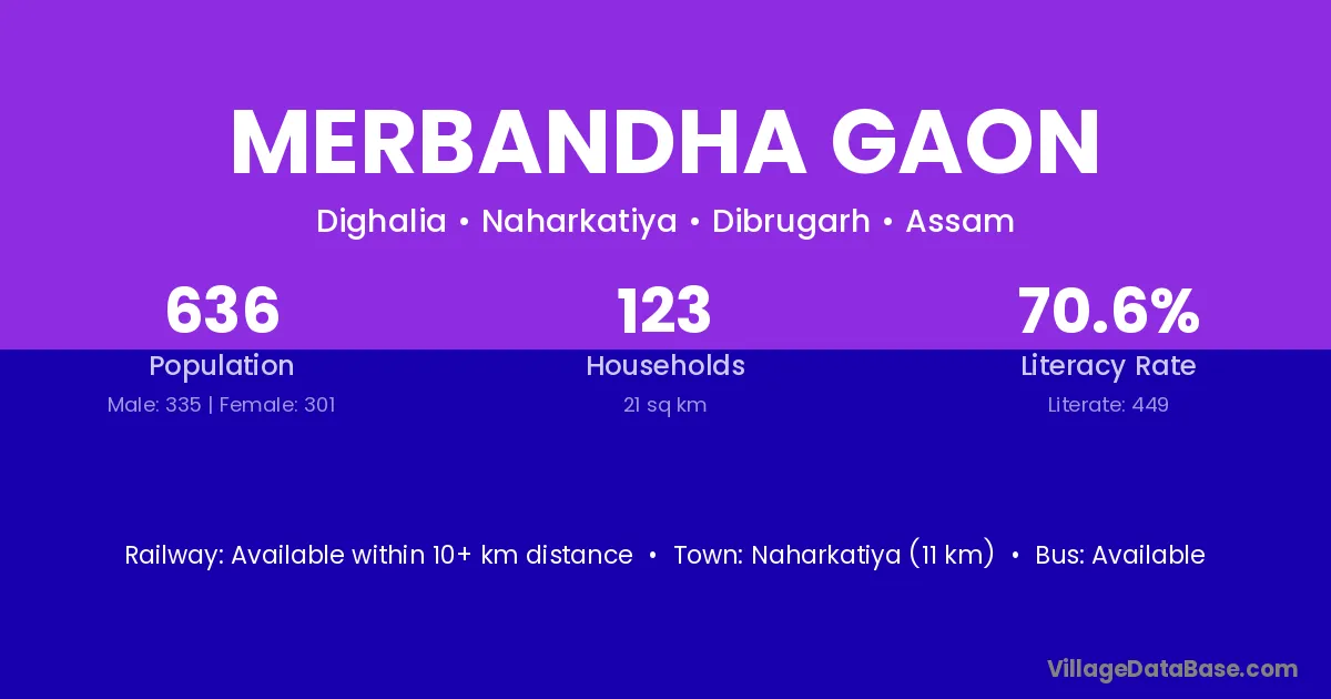 Naharkatiya (11 km) is the nearest town to Merbandha Gaon village for major economic activities and is located approximately 11 km away.