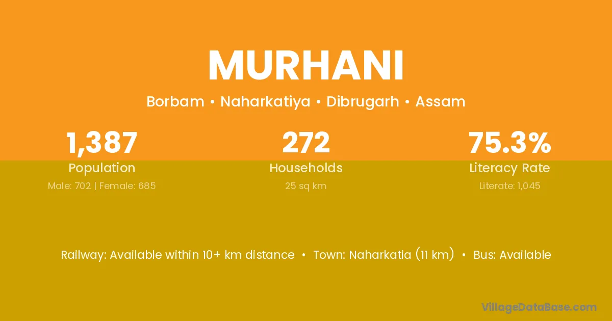 Naharkatia (11 km) is the nearest town to Murhani village for major economic activities and is located approximately 11 km away.