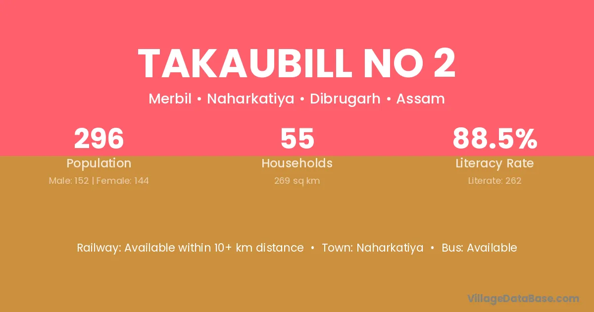 Takaubill No 2 village has a total population of 296 people, of which 152 are males and 144 are females.