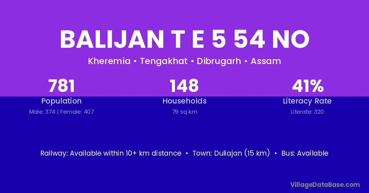 Balijan T E 5 54 No village has a total population of 781 people, of which 374 are males and 407 are females.