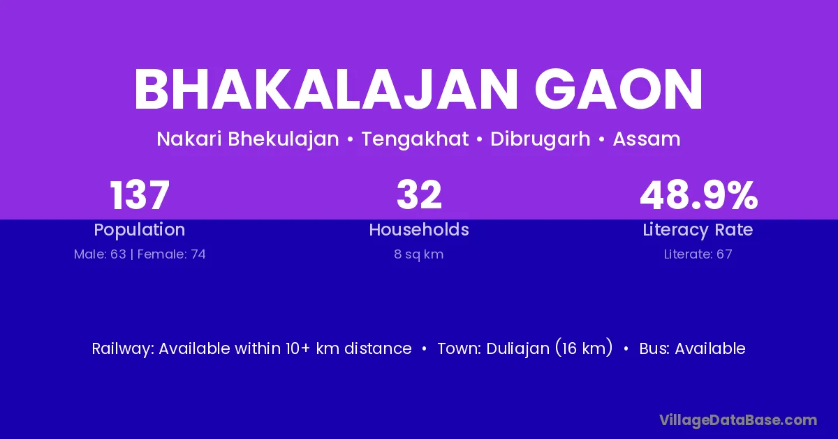 Duliajan (16 km) is the nearest town to Bhakalajan Gaon village for major economic activities and is located approximately 16 km away.