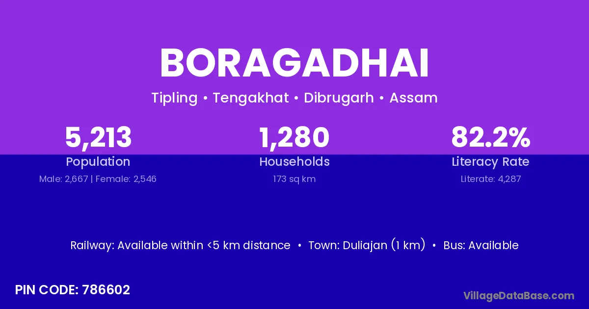 Duliajan (1 km) is the nearest town to Boragadhai village for major economic activities and is located approximately 1 km away.