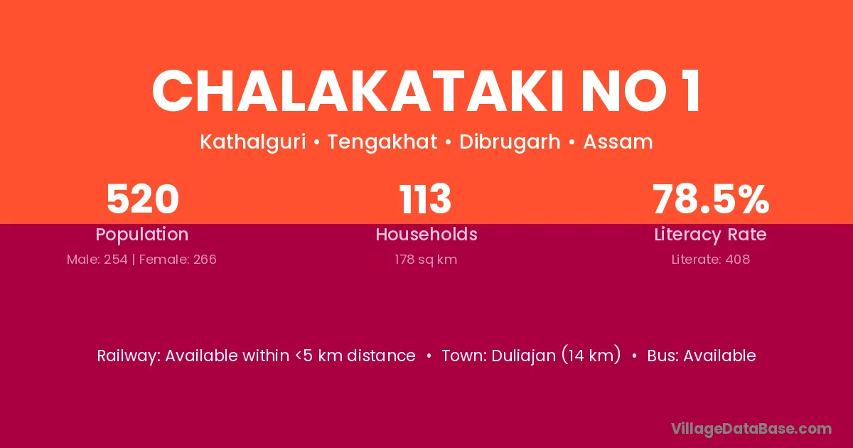 Duliajan (14 km) is the nearest town to Chalakataki No 1 village for major economic activities and is located approximately 14 km away.