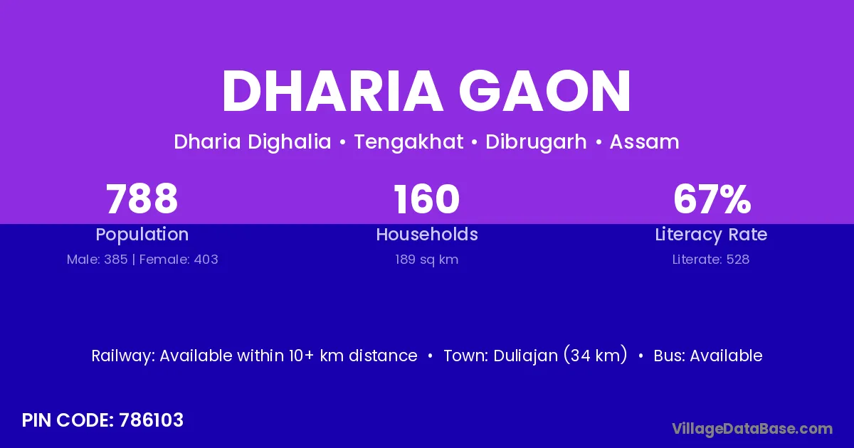 Duliajan (34 km) is the nearest town to Dharia Gaon village for major economic activities and is located approximately 34 km away.