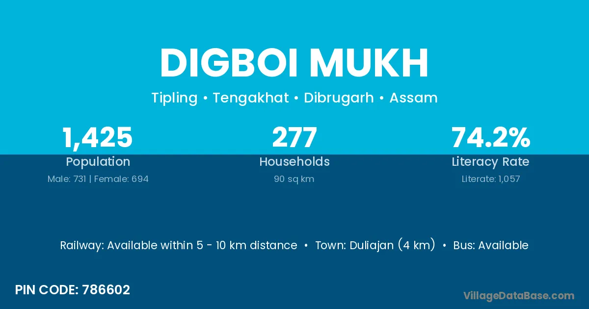 Duliajan (4 km) is the nearest town to Digboi Mukh village for major economic activities and is located approximately 4 km away.