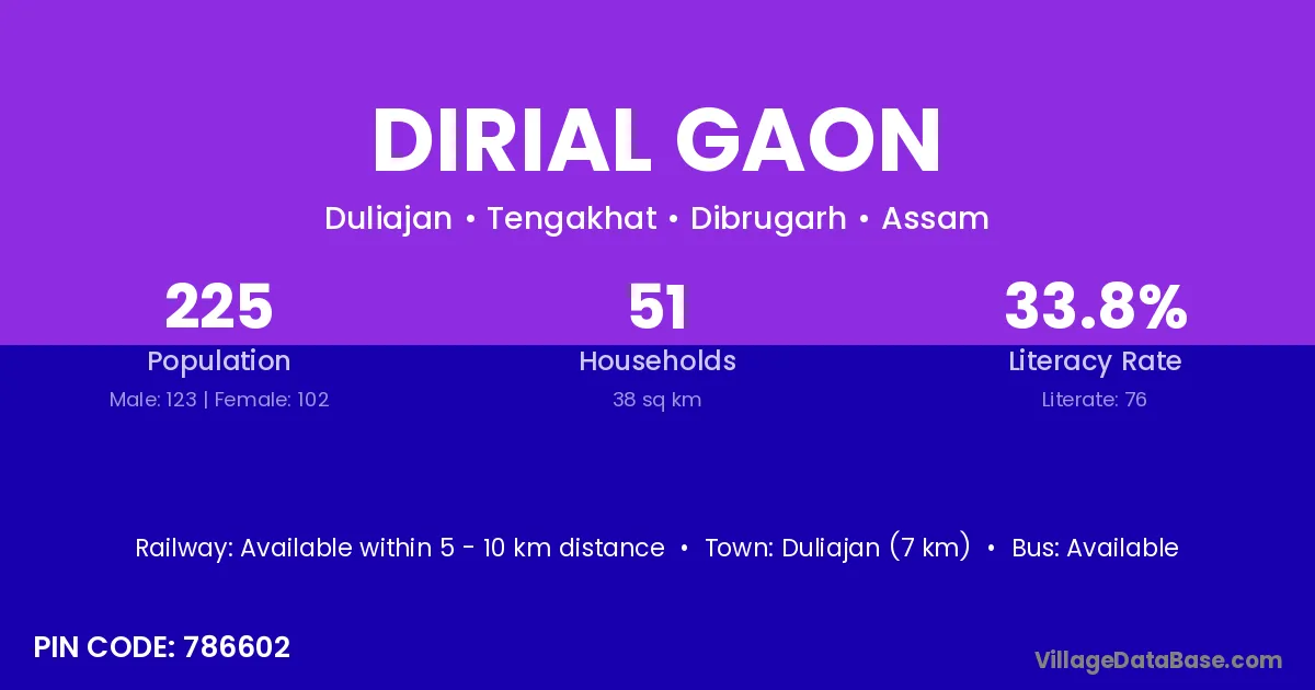 Duliajan (7 km) is the nearest town to Dirial Gaon village for major economic activities and is located approximately 7 km away.