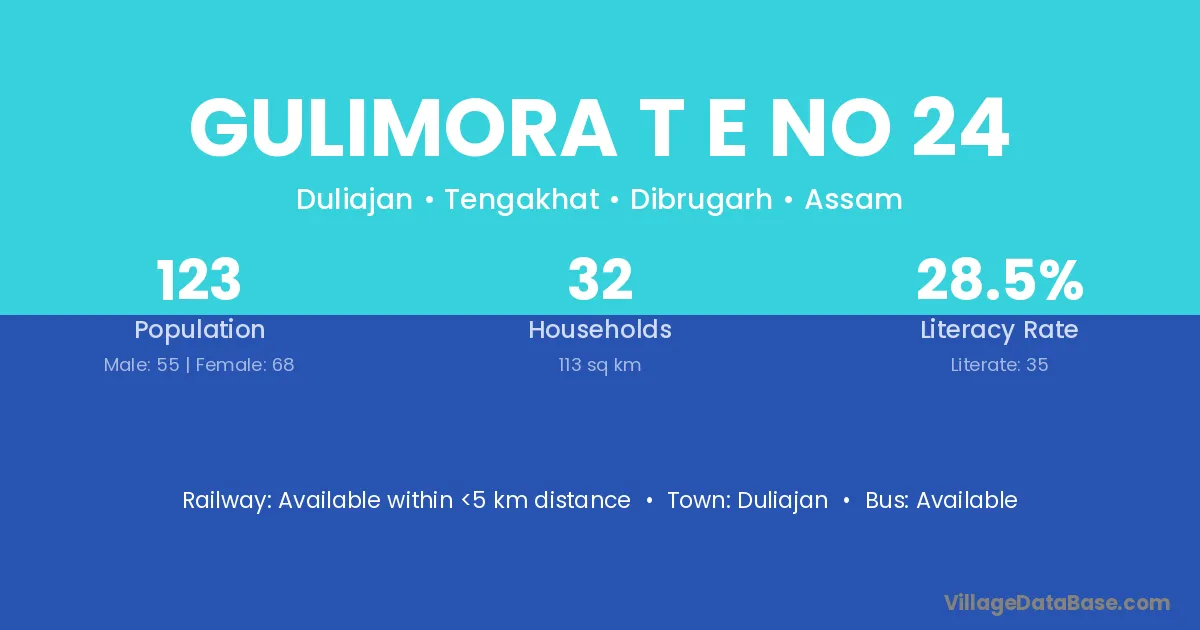 Gulimora T E No 24 village has a total population of 123 people, of which 55 are males and 68 are females.
