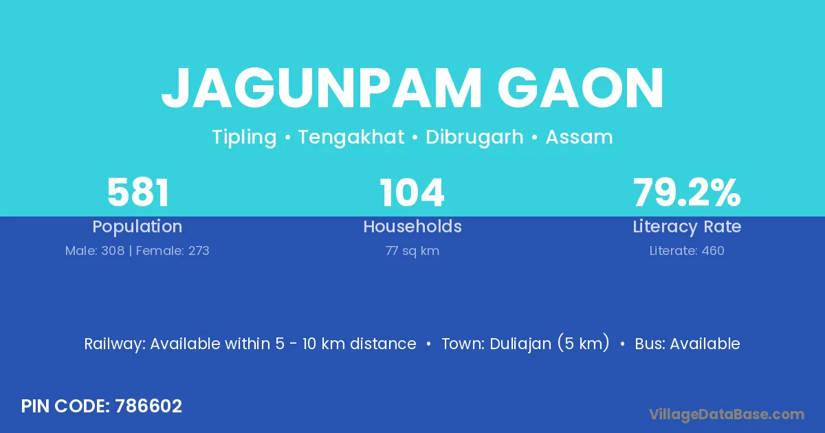 Duliajan (5 km) is the nearest town to Jagunpam Gaon village for major economic activities and is located approximately 5 km away.