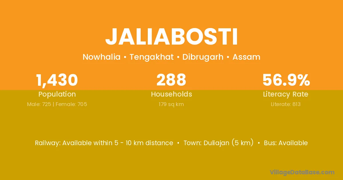 Duliajan (5 km) is the nearest town to Jaliabosti village for major economic activities and is located approximately 5 km away.