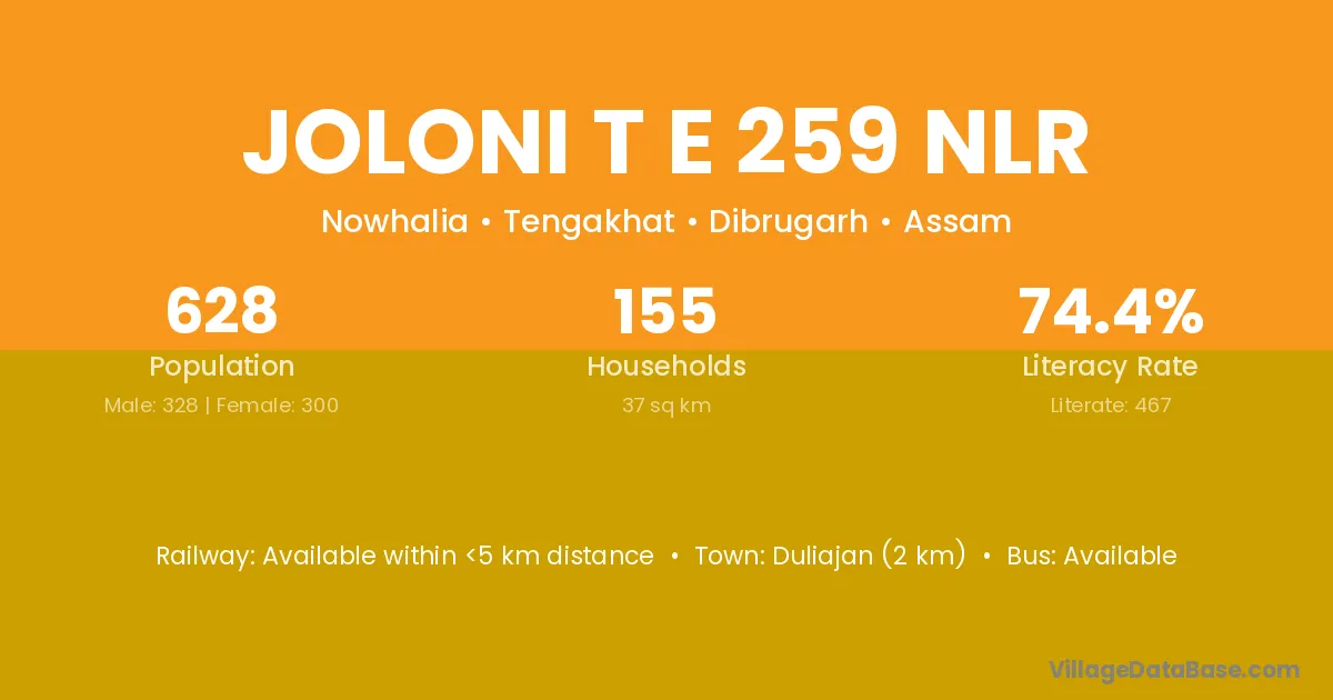 Duliajan (2 km) is the nearest town to Joloni T E 259 Nlr village for major economic activities and is located approximately 2 km away.