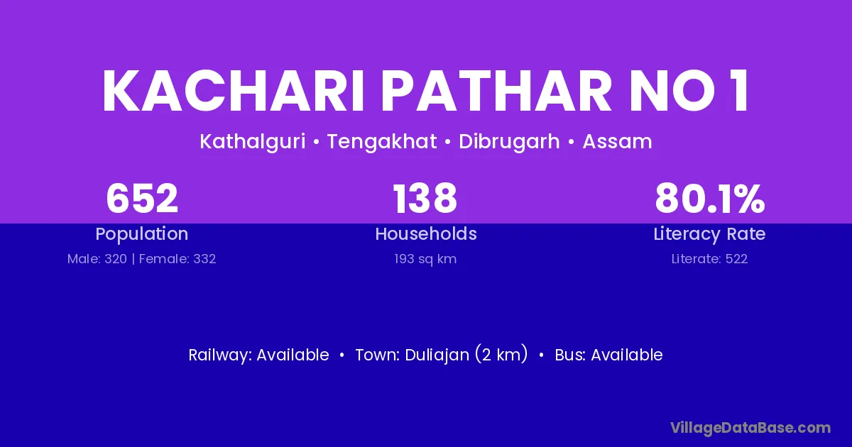 Duliajan (2 km) is the nearest town to Kachari Pathar No 1 village for major economic activities and is located approximately 2 km away.