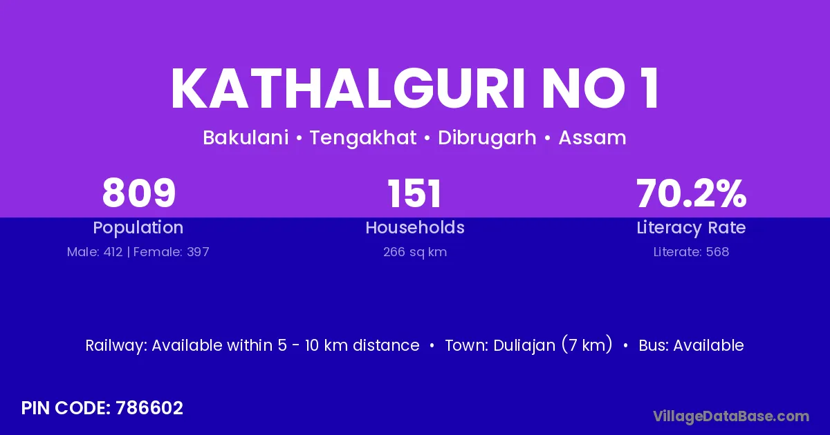 Kathalguri No 1 village has a total population of 809 people, of which 412 are males and 397 are females.
