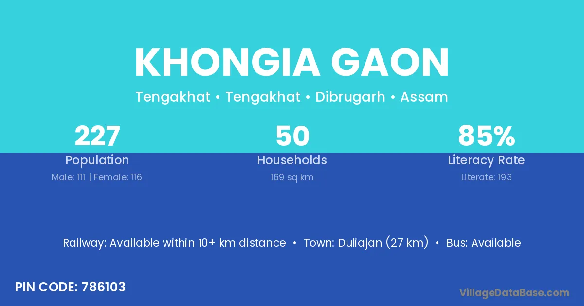 Duliajan (27 km) is the nearest town to Khongia Gaon village for major economic activities and is located approximately 27 km away.
