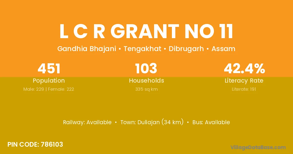 Duliajan (34 km) is the nearest town to L C R Grant No 11 village for major economic activities and is located approximately 34 km away.